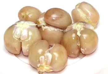 | มังคุด 世界三大美果の一つで、トロピカルフルーツの女王と言われるマンゴスチン(マンゴスタン、マンギス)。 暗紫色の柿に似た形の果実で、あまり見栄えはしない。 しかし、厚い外皮を剥くと写真のように真っ白い清楚な果肉が現れる。 果肉はクリーム状で芳香があり柔らかく、適度な酸味と上品でまろやかな甘味は、まさに女王の名にふさわしい。 更に、美味しいだけでなくコレスチロールを下げる効果があるので動脈硬化症にもよいという。 外皮にはタンニンが多く含まれ、その殺菌作用のためかインドネシアなどでは粉末を万病の薬として用いられているとのこと。 また、インド更紗の染料の原料ともなる。 そのため、外皮の汁が服に付くと落ちなくなるので御注意。 |